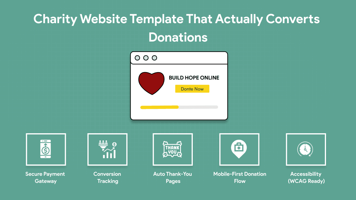 Donation-ready templates have faster launches, built-in donate flows, thank-you pages for tracking, mobile-first donation UIs, SSL secure donation pages, and accessibility compliance (WCAG). These features and tools help charitable organizations raise funds efficiently and provide tools for donor engagement and fundraising efforts.