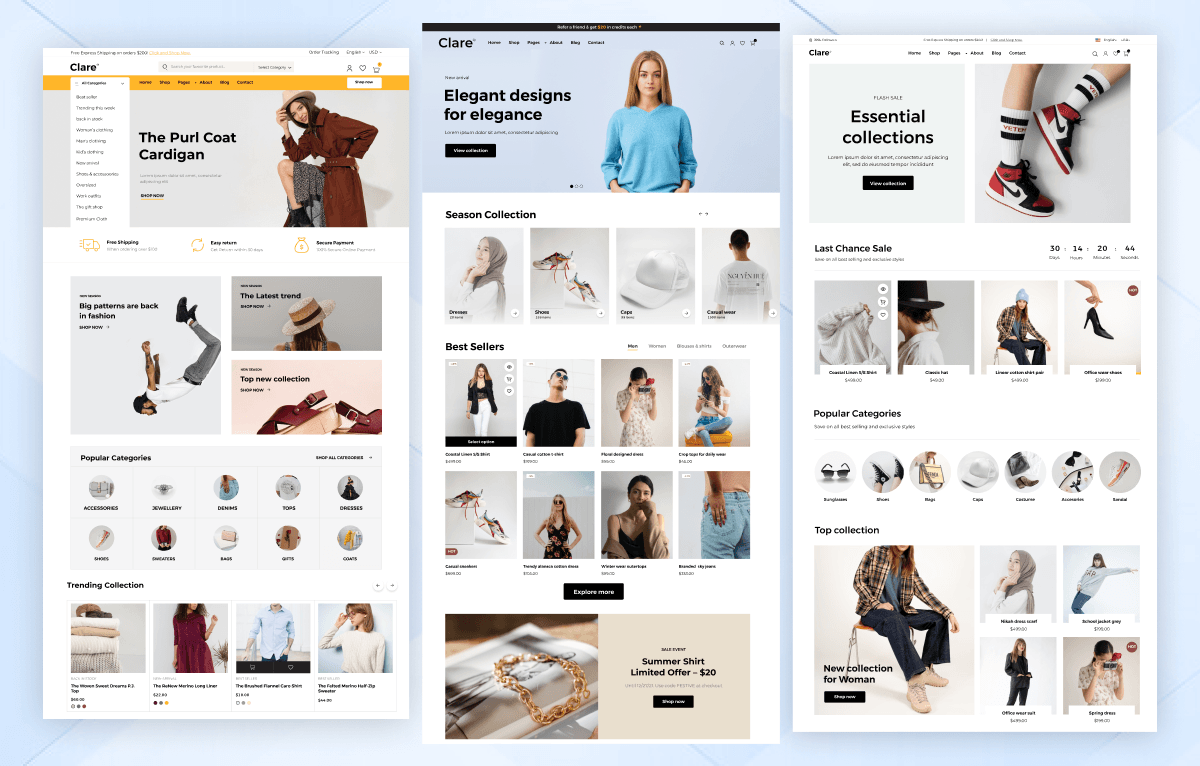 - Clare includes 3 home variants along with category, product list, and product detail layouts for flexible store design.