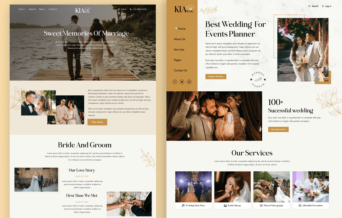 KiaWeds provides all essential pages and components for wedding and event websites. Whether you are creating a wedding planner website HTML template, an HTML wedding planner template, or a responsive wedding planner website HTML template, KiaWeds ensures fast deployment, elegant design, and easy customization for agencies, photographers, and venues.